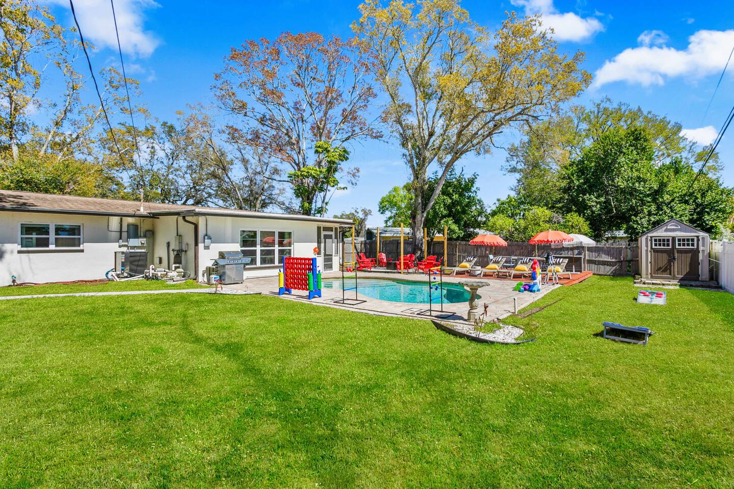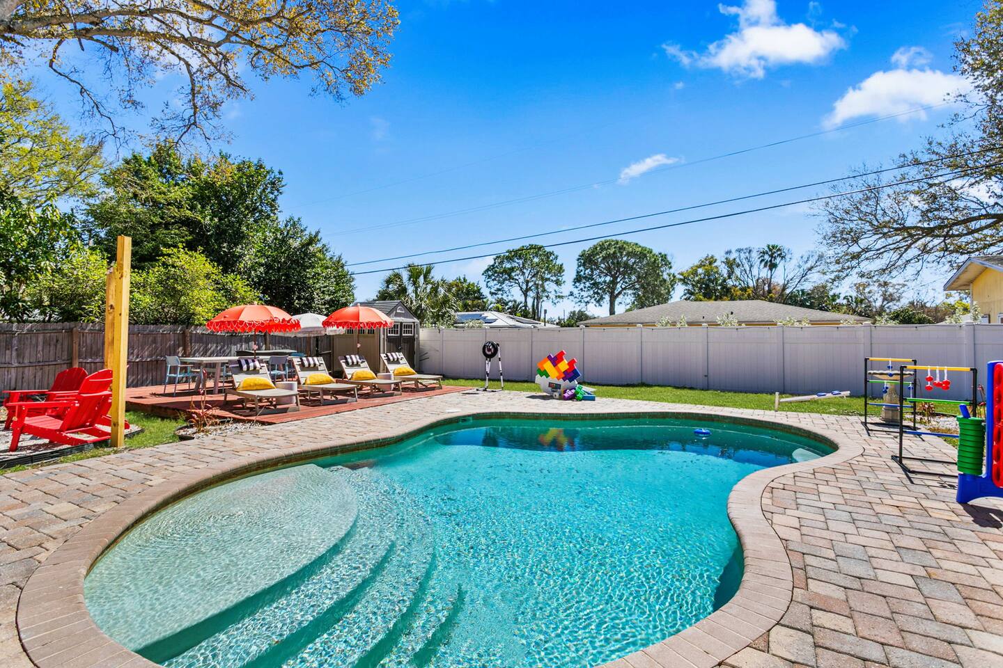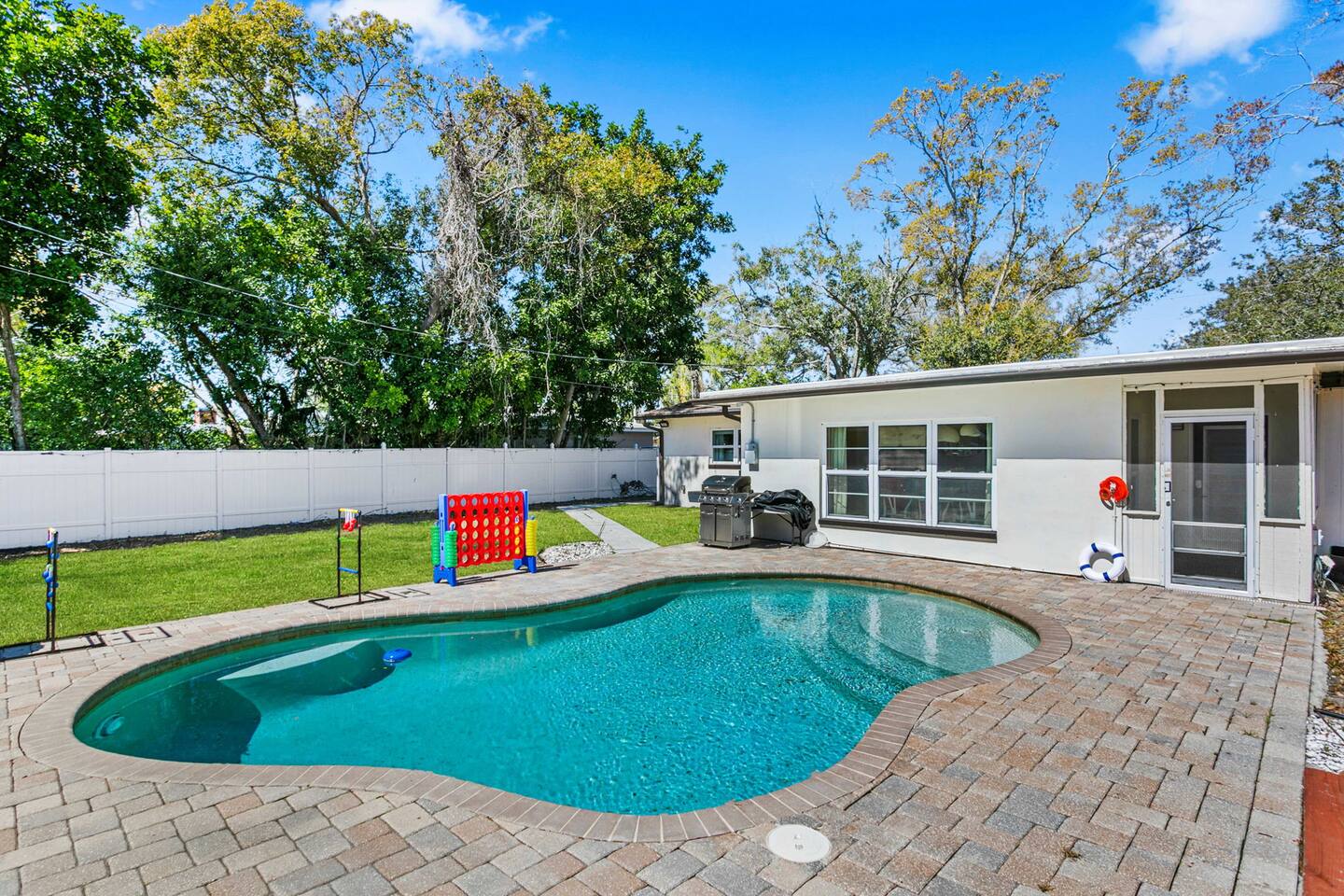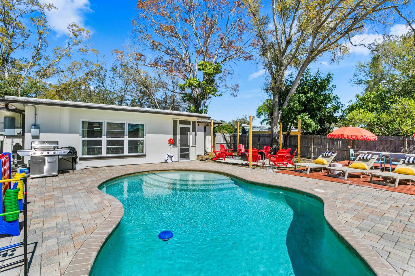 When you arrive, you’ll pull into the driveway and enter the home through the front door using a keypad with your unique code. The layout is designed for easy gathering, with the living room and dining area at the heart of the home and bedrooms located down the hallway for privacy. The home flows naturally from the living area into the dining room and kitchen, while the backyard opens into a spacious outdoor area with a pool, games, and lounge space for relaxing. LIVING ROOM The living room is the central hangout space and connects directly to the dining room and kitchen. This is where everyone can gather after a day out to relax, watch movies, or enjoy a friendly game of shuffleboard. With plenty of comfortable seating and entertainment options, it’s a great place to unwind with family and friends. Highlights of the living room include: ✧ Large L-shaped sectional sofa ✧ Smart TV for streaming ✧ Shuffleboard table ✧ Two comfortable accent chairs ✧ Board games for family game nights KITCHEN Just off the living room, the fully stocked kitchen has everything you need to cook meals during your stay. Whether you're making coffee in the morning or preparing dinner for the group, you'll find the essentials ready to go. The kitchen opens into the dining room so everyone can gather and enjoy meals together. Highlights of our kitchen include: ✧ Full refrigerator, stove, microwave, and dishwasher ✧ Drip coffee maker with coffee provided ✧ Electric hot water kettle ✧ Toaster ✧ Cookware, dishes, and utensils ✧ Cooking basics and seasonings MASTER BEDROOM The primary suite provides a relaxing retreat after a day of exploring or enjoying the backyard. The room features a comfortable king bed, seating area, and TV. The ensuite bathroom includes double vanities and a walk-in shower for added convenience. Highlights of the master suite include: ✧ King bed ✧ Smart TV ✧ Ensuite bathroom with double vanity ✧ Walk-in shower ✧ Ceiling fan ✧ Pack ’n Play available for families OTHER BEDROOMS AND BATHROOM The additional bedrooms are perfect for families or groups traveling together. The bunk room is especially popular with kids and teens, featuring four twin beds and a foosball table for extra fun. The queen bedroom offers a cozy place to relax with comfortable bedding and storage for luggage. Highlights of the other bedrooms and bathroom include: ✧ Bunk room with 4 twin beds ✧ Foosball table in the bunk room ✧ Queen bedroom with comfortable bedding ✧ TVs in every bedroom ✧ Ceiling fans in every bedroom ✧ Full hallway bathroom with walk-in shower OTHER UNIQUE SPACES The dining room sits between the kitchen and living room and features a large dining table with seating for eight, making it perfect for shared meals or board game nights. Families traveling with young children will appreciate the high chair available for use. OUTDOOR SPACE The backyard is designed for relaxing and having fun together. The fully fenced yard provides privacy while offering plenty of space to lounge, play games, or enjoy the pool. During the day, cool off in the private pool, relax on the lounge chairs, or challenge friends and family to a game outside. In the evenings, gather around the fire pit under cozy café lights. Highlights of the outdoor space include: ✧ Private pool (not heated) ✧ Propane fire pit with 8 Adirondack chairs ✧ Outdoor dining table with seating for 6 ✧ Propane grill ✧ 4 lounge chairs for sunbathing ✧ 3 patio umbrellas ✧ Giant Connect Four ✧ Cornhole ✧ Ladder toss ✧ Tetris yard game ✧ Axe throwing game ✧ Café string lights for evening ambiance LOCATION We are only: ✧ Minutes from local restaurants and grocery stores ✧ A short drive to beaches and waterfront parks ✧ Close to shopping and entertainment ✧ Within easy reach of area attractions and outdoor activities ATTENTION TO DETAIL ✔ Cleanliness is a top priority for us and we pride ourselves on welcoming you into a sparkling clean home! ✔ Our home has a washer and dryer along with ironing board and iron for your use. ✔ We keep a first aid kit in the kitchen for minor cuts and scrapes. ✔ We provide premium linens for each guest. ✔ We provide basic paper goods and consumables - paper towels, tissues, toilet paper, dishwasher tablets, dish soap, sponges. ✔ Coffee, creamer, sugar, and tea are included. ✔ High chair and Pack ’n Play available for families traveling with young children. Guests will have access to the entire home and backyard during their stay. A few storage closets are locked for owner supplies and maintenance equipment. Entry is through a smart keypad lock, and guests will receive a unique door code before arrival.