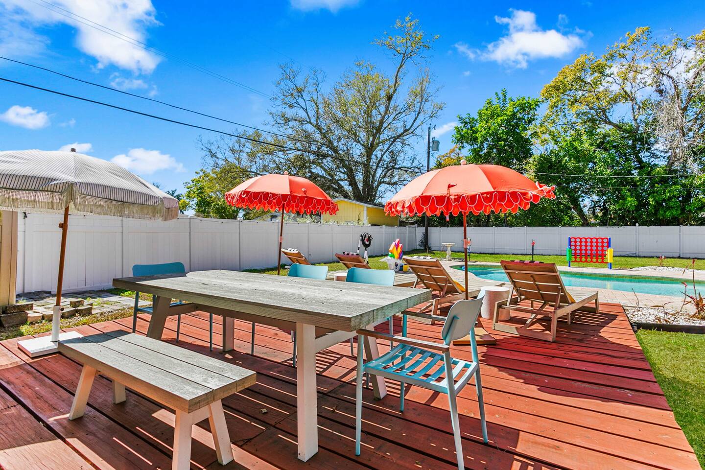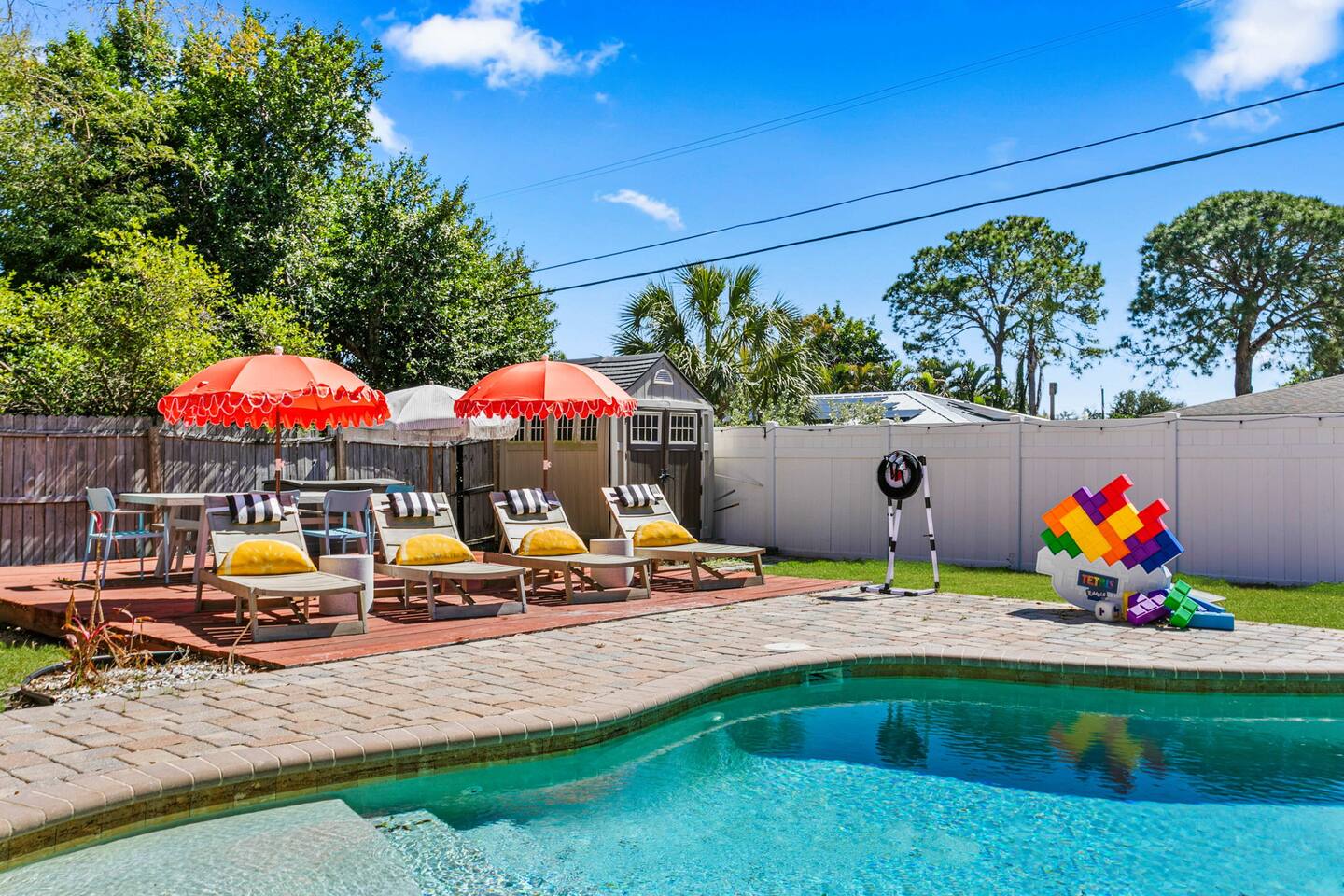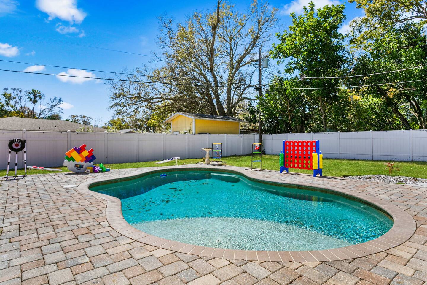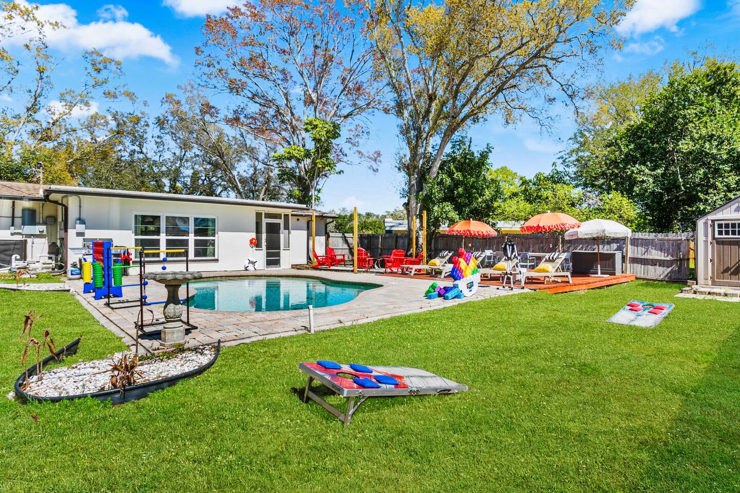 When you arrive, you’ll pull into the driveway and enter the home through the front door using a keypad with your unique code. The layout is designed for easy gathering, with the living room and dining area at the heart of the home and bedrooms located down the hallway for privacy. The home flows naturally from the living area into the dining room and kitchen, while the backyard opens into a spacious outdoor area with a pool, games, and lounge space for relaxing. LIVING ROOM The living room is the central hangout space and connects directly to the dining room and kitchen. This is where everyone can gather after a day out to relax, watch movies, or enjoy a friendly game of shuffleboard. With plenty of comfortable seating and entertainment options, it’s a great place to unwind with family and friends. Highlights of the living room include: ✧ Large L-shaped sectional sofa ✧ Smart TV for streaming ✧ Shuffleboard table ✧ Two comfortable accent chairs ✧ Board games for family game nights KITCHEN Just off the living room, the fully stocked kitchen has everything you need to cook meals during your stay. Whether you're making coffee in the morning or preparing dinner for the group, you'll find the essentials ready to go. The kitchen opens into the dining room so everyone can gather and enjoy meals together. Highlights of our kitchen include: ✧ Full refrigerator, stove, microwave, and dishwasher ✧ Drip coffee maker with coffee provided ✧ Electric hot water kettle ✧ Toaster ✧ Cookware, dishes, and utensils ✧ Cooking basics and seasonings MASTER BEDROOM The primary suite provides a relaxing retreat after a day of exploring or enjoying the backyard. The room features a comfortable king bed, seating area, and TV. The ensuite bathroom includes double vanities and a walk-in shower for added convenience. Highlights of the master suite include: ✧ King bed ✧ Smart TV ✧ Ensuite bathroom with double vanity ✧ Walk-in shower ✧ Ceiling fan ✧ Pack ’n Play available for families OTHER BEDROOMS AND BATHROOM The additional bedrooms are perfect for families or groups traveling together. The bunk room is especially popular with kids and teens, featuring four twin beds and a foosball table for extra fun. The queen bedroom offers a cozy place to relax with comfortable bedding and storage for luggage. Highlights of the other bedrooms and bathroom include: ✧ Bunk room with 4 twin beds ✧ Foosball table in the bunk room ✧ Queen bedroom with comfortable bedding ✧ TVs in every bedroom ✧ Ceiling fans in every bedroom ✧ Full hallway bathroom with walk-in shower OTHER UNIQUE SPACES The dining room sits between the kitchen and living room and features a large dining table with seating for eight, making it perfect for shared meals or board game nights. Families traveling with young children will appreciate the high chair available for use. OUTDOOR SPACE The backyard is designed for relaxing and having fun together. The fully fenced yard provides privacy while offering plenty of space to lounge, play games, or enjoy the pool. During the day, cool off in the private pool, relax on the lounge chairs, or challenge friends and family to a game outside. In the evenings, gather around the fire pit under cozy café lights. Highlights of the outdoor space include: ✧ Private pool (not heated) ✧ Propane fire pit with 8 Adirondack chairs ✧ Outdoor dining table with seating for 6 ✧ Propane grill ✧ 4 lounge chairs for sunbathing ✧ 3 patio umbrellas ✧ Giant Connect Four ✧ Cornhole ✧ Ladder toss ✧ Tetris yard game ✧ Axe throwing game ✧ Café string lights for evening ambiance LOCATION We are only: ✧ Minutes from local restaurants and grocery stores ✧ A short drive to beaches and waterfront parks ✧ Close to shopping and entertainment ✧ Within easy reach of area attractions and outdoor activities ATTENTION TO DETAIL ✔ Cleanliness is a top priority for us and we pride ourselves on welcoming you into a sparkling clean home! ✔ Our home has a washer and dryer along with ironing board and iron for your use. ✔ We keep a first aid kit in the kitchen for minor cuts and scrapes. ✔ We provide premium linens for each guest. ✔ We provide basic paper goods and consumables - paper towels, tissues, toilet paper, dishwasher tablets, dish soap, sponges. ✔ Coffee, creamer, sugar, and tea are included. ✔ High chair and Pack ’n Play available for families traveling with young children. Guests will have access to the entire home and backyard during their stay. A few storage closets are locked for owner supplies and maintenance equipment. Entry is through a smart keypad lock, and guests will receive a unique door code before arrival.