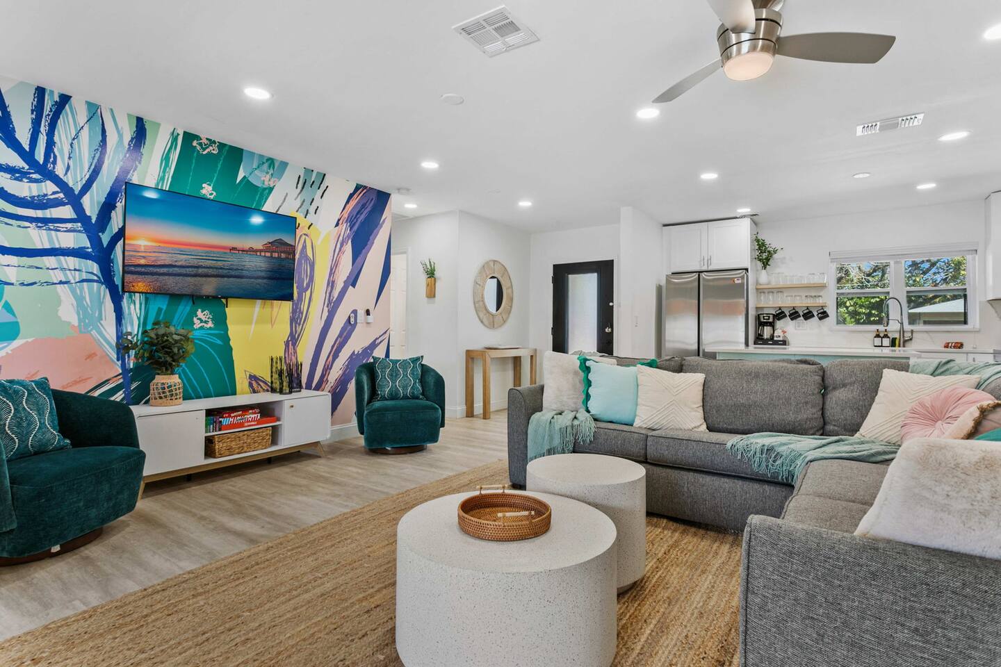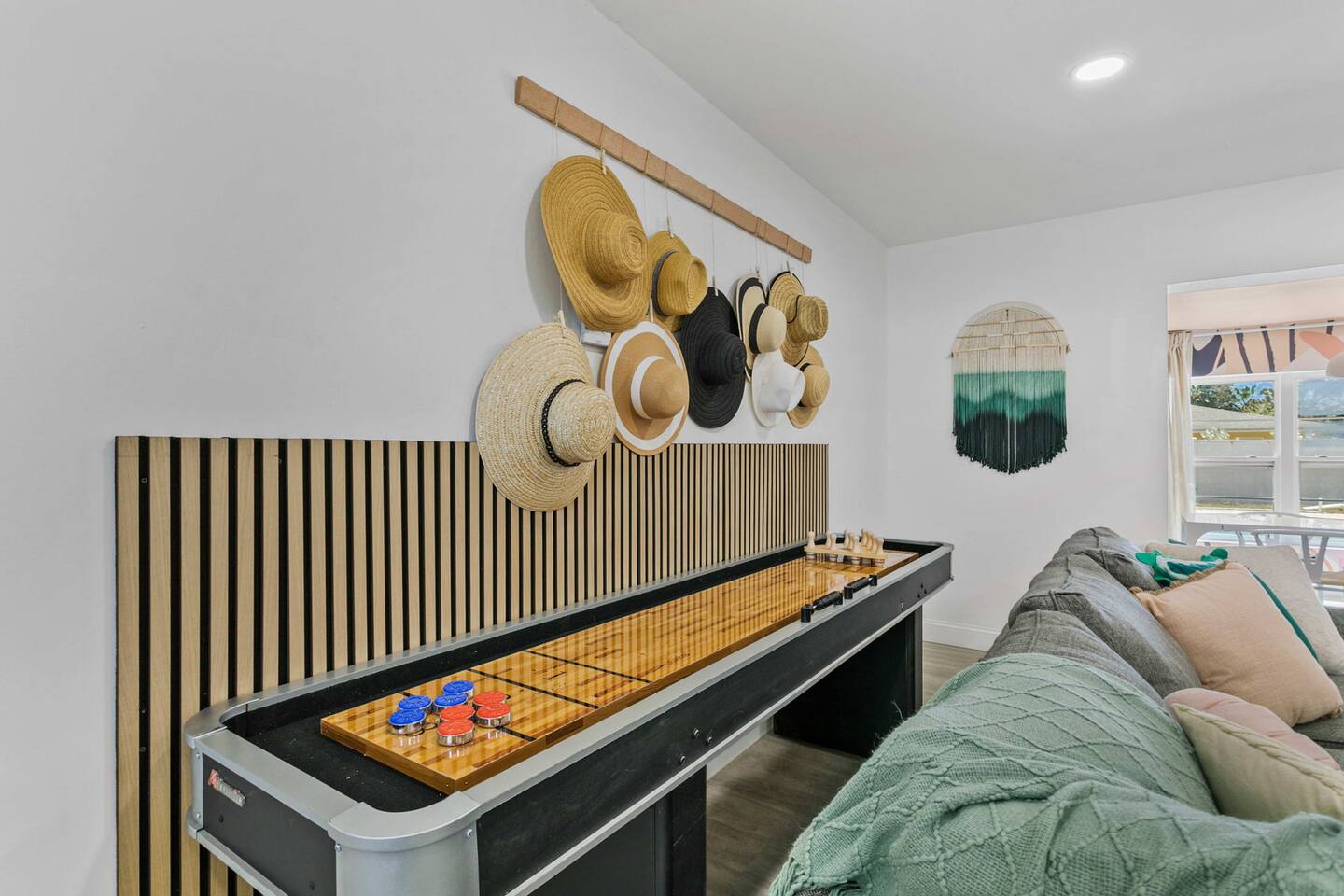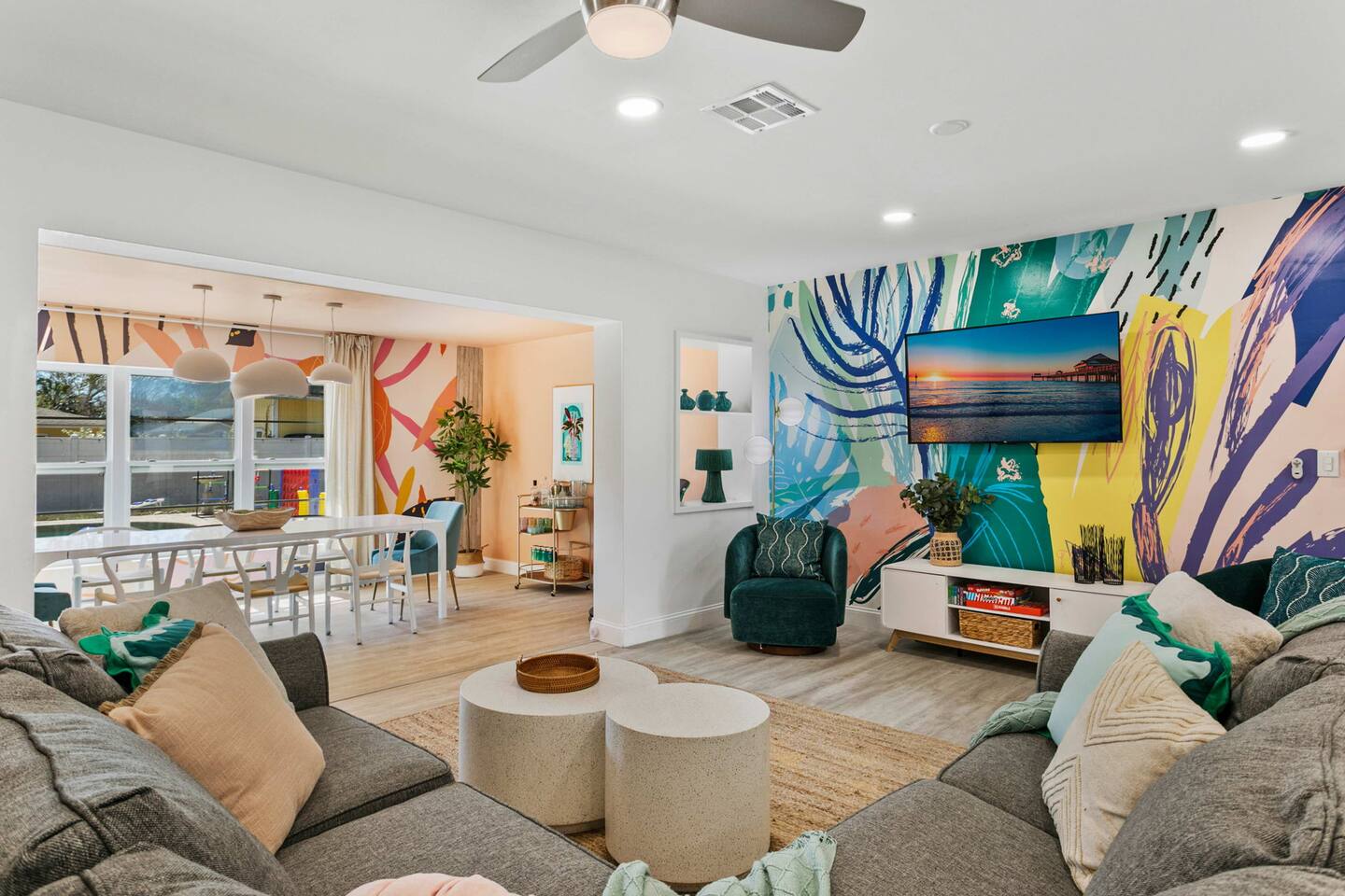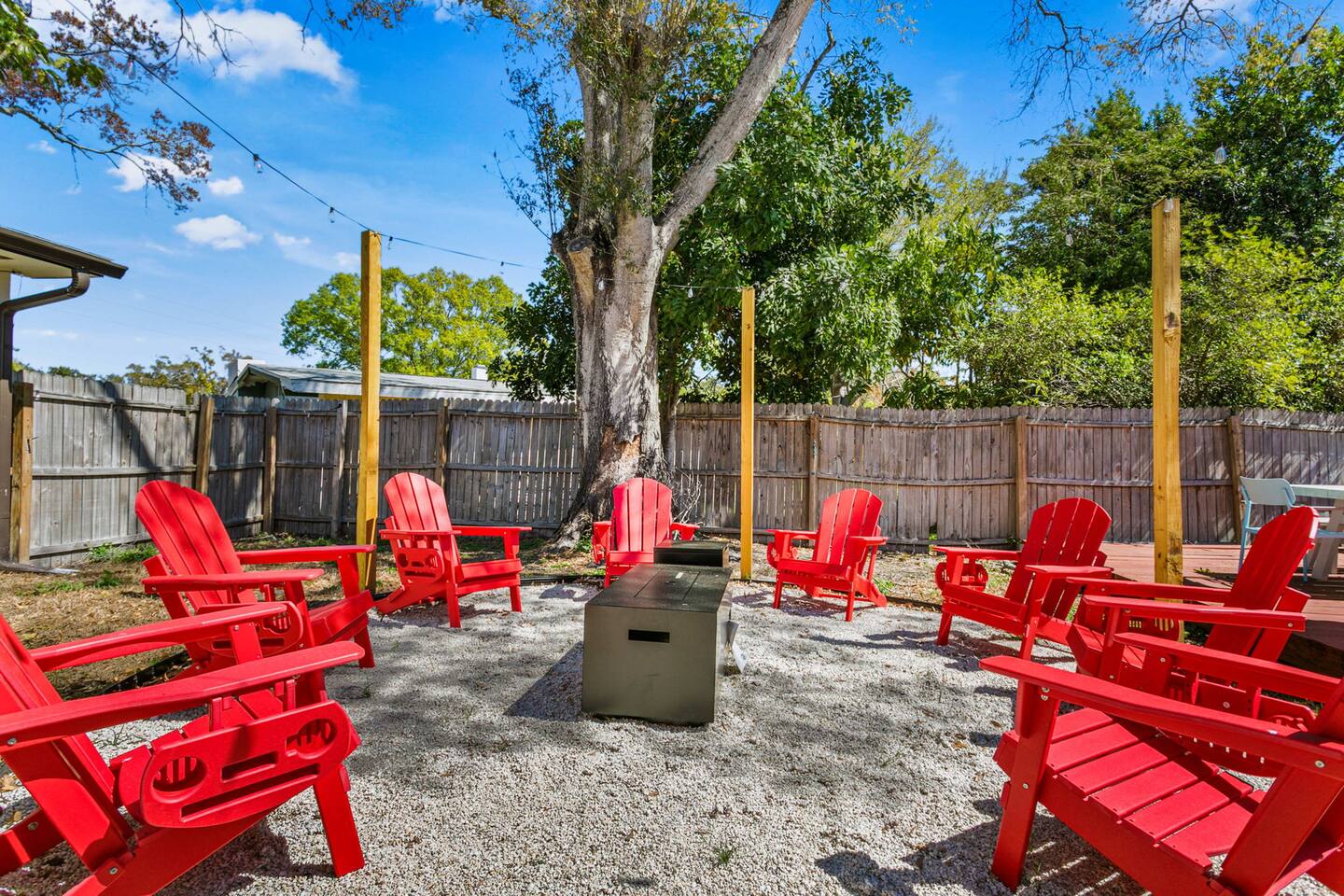 When you arrive, you’ll pull into the driveway and enter the home through the front door using a keypad with your unique code. The layout is designed for easy gathering, with the living room and dining area at the heart of the home and bedrooms located down the hallway for privacy. The home flows naturally from the living area into the dining room and kitchen, while the backyard opens into a spacious outdoor area with a pool, games, and lounge space for relaxing. LIVING ROOM The living room is the central hangout space and connects directly to the dining room and kitchen. This is where everyone can gather after a day out to relax, watch movies, or enjoy a friendly game of shuffleboard. With plenty of comfortable seating and entertainment options, it’s a great place to unwind with family and friends. Highlights of the living room include: ✧ Large L-shaped sectional sofa ✧ Smart TV for streaming ✧ Shuffleboard table ✧ Two comfortable accent chairs ✧ Board games for family game nights KITCHEN Just off the living room, the fully stocked kitchen has everything you need to cook meals during your stay. Whether you're making coffee in the morning or preparing dinner for the group, you'll find the essentials ready to go. The kitchen opens into the dining room so everyone can gather and enjoy meals together. Highlights of our kitchen include: ✧ Full refrigerator, stove, microwave, and dishwasher ✧ Drip coffee maker with coffee provided ✧ Electric hot water kettle ✧ Toaster ✧ Cookware, dishes, and utensils ✧ Cooking basics and seasonings MASTER BEDROOM The primary suite provides a relaxing retreat after a day of exploring or enjoying the backyard. The room features a comfortable king bed, seating area, and TV. The ensuite bathroom includes double vanities and a walk-in shower for added convenience. Highlights of the master suite include: ✧ King bed ✧ Smart TV ✧ Ensuite bathroom with double vanity ✧ Walk-in shower ✧ Ceiling fan ✧ Pack ’n Play available for families OTHER BEDROOMS AND BATHROOM The additional bedrooms are perfect for families or groups traveling together. The bunk room is especially popular with kids and teens, featuring four twin beds and a foosball table for extra fun. The queen bedroom offers a cozy place to relax with comfortable bedding and storage for luggage. Highlights of the other bedrooms and bathroom include: ✧ Bunk room with 4 twin beds ✧ Foosball table in the bunk room ✧ Queen bedroom with comfortable bedding ✧ TVs in every bedroom ✧ Ceiling fans in every bedroom ✧ Full hallway bathroom with walk-in shower OTHER UNIQUE SPACES The dining room sits between the kitchen and living room and features a large dining table with seating for eight, making it perfect for shared meals or board game nights. Families traveling with young children will appreciate the high chair available for use. OUTDOOR SPACE The backyard is designed for relaxing and having fun together. The fully fenced yard provides privacy while offering plenty of space to lounge, play games, or enjoy the pool. During the day, cool off in the private pool, relax on the lounge chairs, or challenge friends and family to a game outside. In the evenings, gather around the fire pit under cozy café lights. Highlights of the outdoor space include: ✧ Private pool (not heated) ✧ Propane fire pit with 8 Adirondack chairs ✧ Outdoor dining table with seating for 6 ✧ Propane grill ✧ 4 lounge chairs for sunbathing ✧ 3 patio umbrellas ✧ Giant Connect Four ✧ Cornhole ✧ Ladder toss ✧ Tetris yard game ✧ Axe throwing game ✧ Café string lights for evening ambiance LOCATION We are only: ✧ Minutes from local restaurants and grocery stores ✧ A short drive to beaches and waterfront parks ✧ Close to shopping and entertainment ✧ Within easy reach of area attractions and outdoor activities ATTENTION TO DETAIL ✔ Cleanliness is a top priority for us and we pride ourselves on welcoming you into a sparkling clean home! ✔ Our home has a washer and dryer along with ironing board and iron for your use. ✔ We keep a first aid kit in the kitchen for minor cuts and scrapes. ✔ We provide premium linens for each guest. ✔ We provide basic paper goods and consumables - paper towels, tissues, toilet paper, dishwasher tablets, dish soap, sponges. ✔ Coffee, creamer, sugar, and tea are included. ✔ High chair and Pack ’n Play available for families traveling with young children. Guests will have access to the entire home and backyard during their stay. A few storage closets are locked for owner supplies and maintenance equipment. Entry is through a smart keypad lock, and guests will receive a unique door code before arrival.