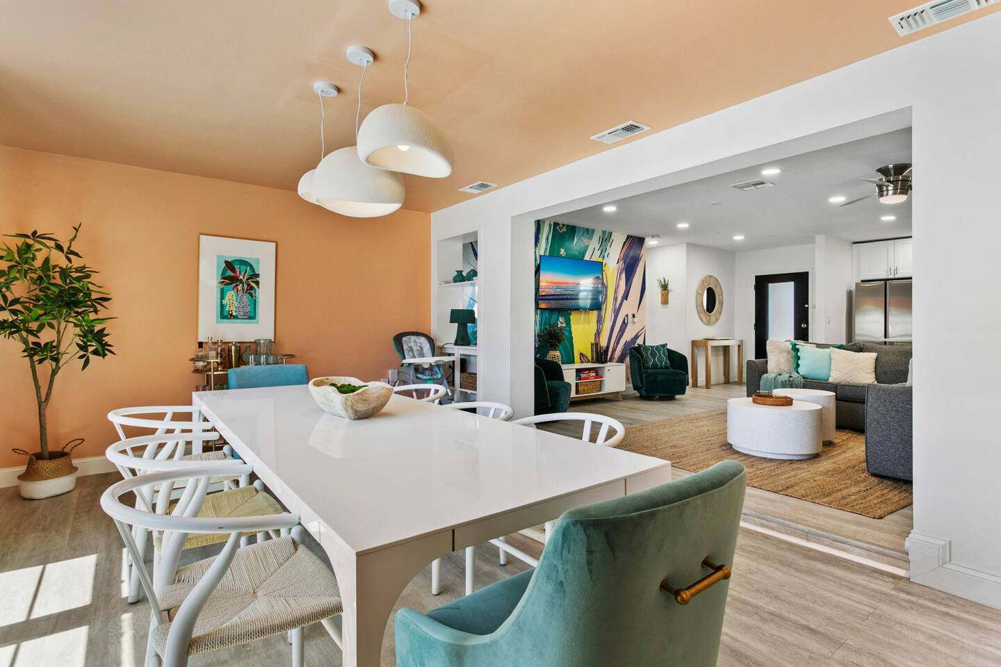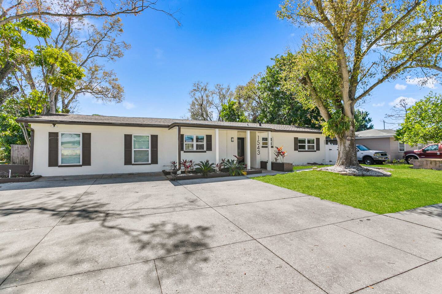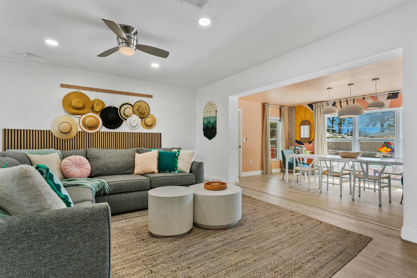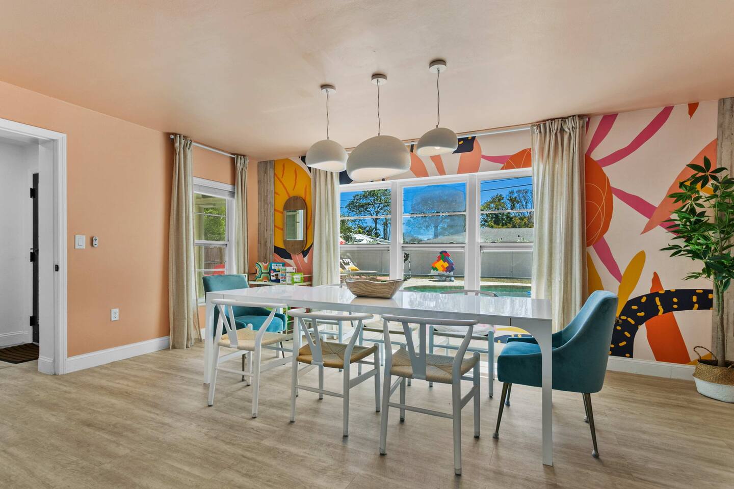 When you arrive, you’ll pull into the driveway and enter the home through the front door using a keypad with your unique code. The layout is designed for easy gathering, with the living room and dining area at the heart of the home and bedrooms located down the hallway for privacy. The home flows naturally from the living area into the dining room and kitchen, while the backyard opens into a spacious outdoor area with a pool, games, and lounge space for relaxing. LIVING ROOM The living room is the central hangout space and connects directly to the dining room and kitchen. This is where everyone can gather after a day out to relax, watch movies, or enjoy a friendly game of shuffleboard. With plenty of comfortable seating and entertainment options, it’s a great place to unwind with family and friends. Highlights of the living room include: ✧ Large L-shaped sectional sofa ✧ Smart TV for streaming ✧ Shuffleboard table ✧ Two comfortable accent chairs ✧ Board games for family game nights KITCHEN Just off the living room, the fully stocked kitchen has everything you need to cook meals during your stay. Whether you're making coffee in the morning or preparing dinner for the group, you'll find the essentials ready to go. The kitchen opens into the dining room so everyone can gather and enjoy meals together. Highlights of our kitchen include: ✧ Full refrigerator, stove, microwave, and dishwasher ✧ Drip coffee maker with coffee provided ✧ Electric hot water kettle ✧ Toaster ✧ Cookware, dishes, and utensils ✧ Cooking basics and seasonings MASTER BEDROOM The primary suite provides a relaxing retreat after a day of exploring or enjoying the backyard. The room features a comfortable king bed, seating area, and TV. The ensuite bathroom includes double vanities and a walk-in shower for added convenience. Highlights of the master suite include: ✧ King bed ✧ Smart TV ✧ Ensuite bathroom with double vanity ✧ Walk-in shower ✧ Ceiling fan ✧ Pack ’n Play available for families OTHER BEDROOMS AND BATHROOM The additional bedrooms are perfect for families or groups traveling together. The bunk room is especially popular with kids and teens, featuring four twin beds and a foosball table for extra fun. The queen bedroom offers a cozy place to relax with comfortable bedding and storage for luggage. Highlights of the other bedrooms and bathroom include: ✧ Bunk room with 4 twin beds ✧ Foosball table in the bunk room ✧ Queen bedroom with comfortable bedding ✧ TVs in every bedroom ✧ Ceiling fans in every bedroom ✧ Full hallway bathroom with walk-in shower OTHER UNIQUE SPACES The dining room sits between the kitchen and living room and features a large dining table with seating for eight, making it perfect for shared meals or board game nights. Families traveling with young children will appreciate the high chair available for use. OUTDOOR SPACE The backyard is designed for relaxing and having fun together. The fully fenced yard provides privacy while offering plenty of space to lounge, play games, or enjoy the pool. During the day, cool off in the private pool, relax on the lounge chairs, or challenge friends and family to a game outside. In the evenings, gather around the fire pit under cozy café lights. Highlights of the outdoor space include: ✧ Private pool (not heated) ✧ Propane fire pit with 8 Adirondack chairs ✧ Outdoor dining table with seating for 6 ✧ Propane grill ✧ 4 lounge chairs for sunbathing ✧ 3 patio umbrellas ✧ Giant Connect Four ✧ Cornhole ✧ Ladder toss ✧ Tetris yard game ✧ Axe throwing game ✧ Café string lights for evening ambiance LOCATION We are only: ✧ Minutes from local restaurants and grocery stores ✧ A short drive to beaches and waterfront parks ✧ Close to shopping and entertainment ✧ Within easy reach of area attractions and outdoor activities ATTENTION TO DETAIL ✔ Cleanliness is a top priority for us and we pride ourselves on welcoming you into a sparkling clean home! ✔ Our home has a washer and dryer along with ironing board and iron for your use. ✔ We keep a first aid kit in the kitchen for minor cuts and scrapes. ✔ We provide premium linens for each guest. ✔ We provide basic paper goods and consumables - paper towels, tissues, toilet paper, dishwasher tablets, dish soap, sponges. ✔ Coffee, creamer, sugar, and tea are included. ✔ High chair and Pack ’n Play available for families traveling with young children. Guests will have access to the entire home and backyard during their stay. A few storage closets are locked for owner supplies and maintenance equipment. Entry is through a smart keypad lock, and guests will receive a unique door code before arrival.
