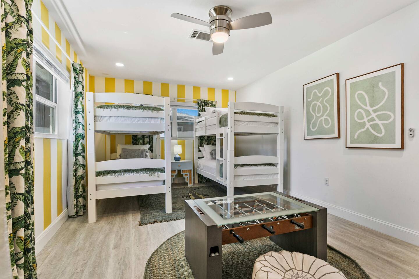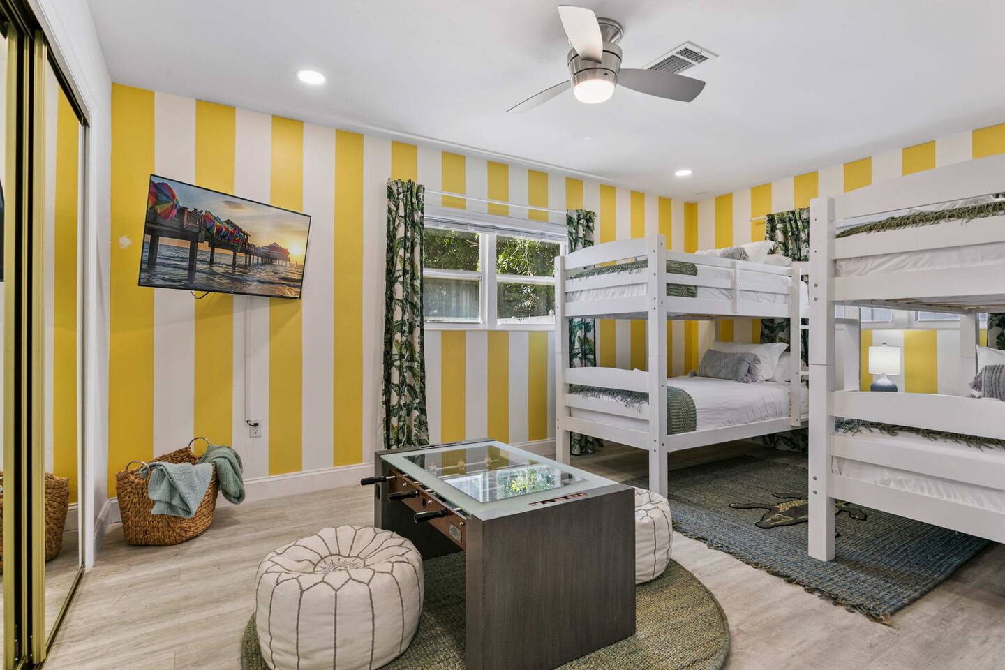 Bring the whole family for a fun and relaxing getaway! This family-friendly home features a private pool, fenced backyard, fire pit with Adirondack chairs, and outdoor games like giant Connect Four, cornhole, and ladder toss. Inside, enjoy a spacious living room with shuffleboard, a fully stocked kitchen, and a bunk room with 4 twin beds + foosball—perfect for kids and groups.